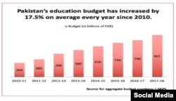 دملګرو ملتونو د تعلیم او ساېنس ادارې (یونیسکو) په وروستیو کې په پاکستان غږ هم شوی چې که پاکستان د تعليم لپاره په خپله قامی بودیجه یا بجټ سېوا نه کړو نو د کال ۲۰۳۰مه پورې به په ۴ کې ۱ ماشوم د سکول نه بهر وي. د دغې په اړه میرمن نادیه ووېل چې پاکستان د کال ۲۰۰۱ نه را په دیخوا د تعلیم په قامي بودیجه کې ۱۸ فیصده اضافه راوستې او د دغې په اړه یې یو ګراف هم شریک کړو.