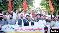 مظاهرې ته خپله وینا کې دعوامي نیشنل ګوند وتلي مشر میا افتخار حسین ویلي زمونږ معدنیات تباه کړل شول اؤ اوس مو ځنګلونه هم سوځول کیږي.
