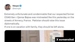 په امریکا کې مېشت پاکستانی صحافي وقاص د فرانس د واقعې په حواله خفګان ښودلی او پخپل ټوېټر یې ویلي: «انتهایي بدقسمتي او قابل مذمت دی چې زمونږ قدرمن پخوانی سرلښکر جنرل (ر) قمر باجوه پرود دغسې د فرانس د انسي ښار په کوڅو کې له دغسې بدسلوکۍ سره مخ شو. پاکستان ته په کار ده چې دا موضوع د سفارتکاري لارو راپورته کړي. که څوک د خپلې کورنۍ سره په چکر تللی وي، په کار ده چې ځانله پرېښودل شي.»