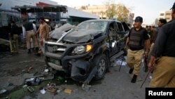 د پولیس چاراکو په وینا دویمه چاودنه نن د جمعې په ورځ د پښین ضلعې عدالت ته نزدې سړک باندې شوې، دوه پولیس عسکر او څلور لارويان پکې ټپیان شوي دي.